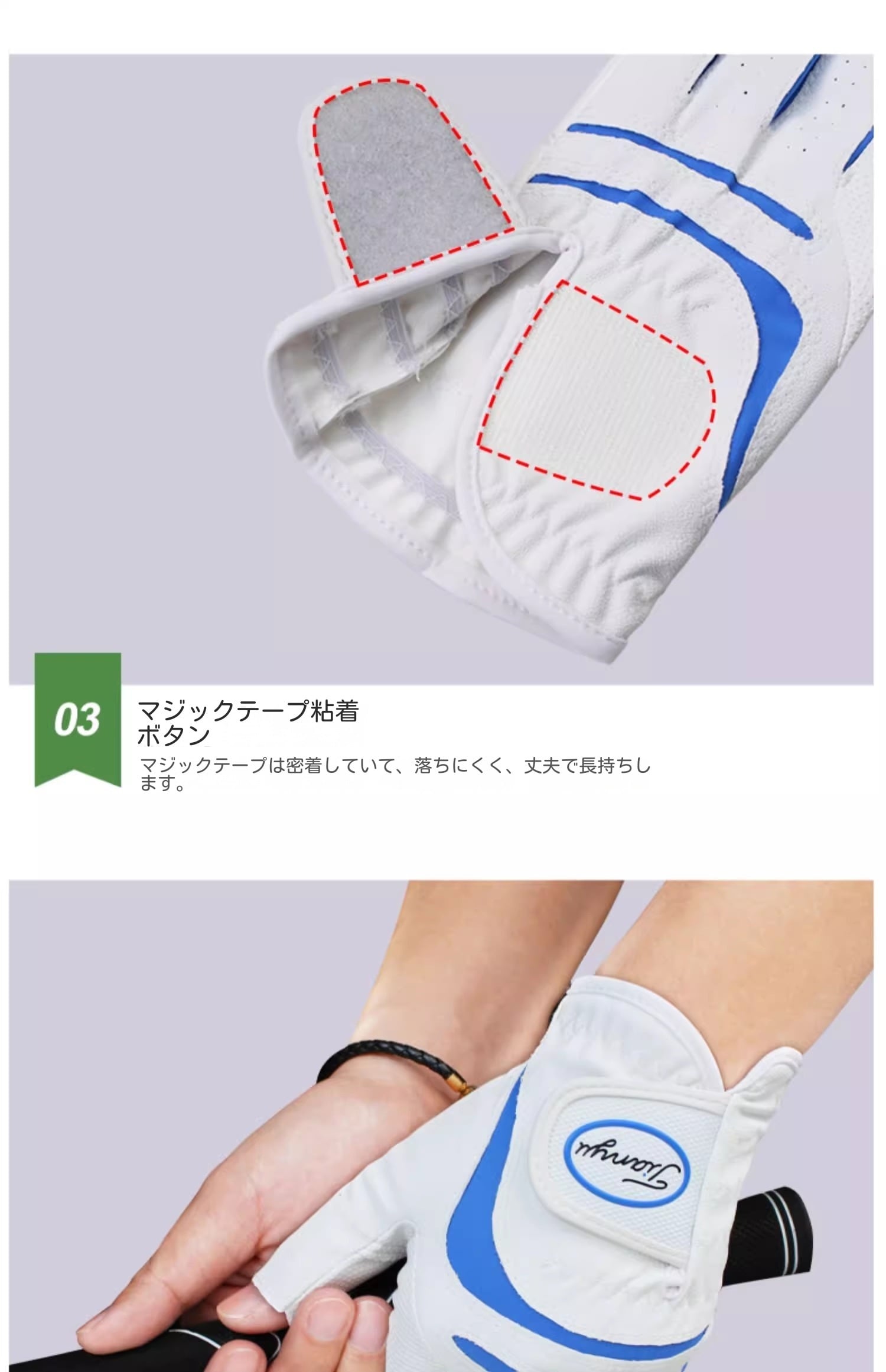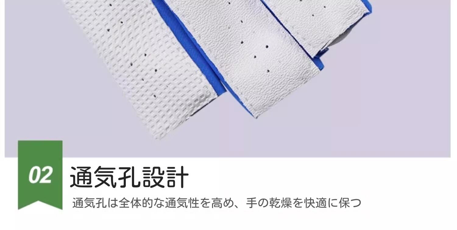 柔軟性と耐摩耗性に優れた高弾性ライカ素材を採用。関節の動きをサポートし、スイング時の指の動きをより柔軟にします。通気孔設計により全体的な通気性を高め、手の乾燥を快適に保ちます。