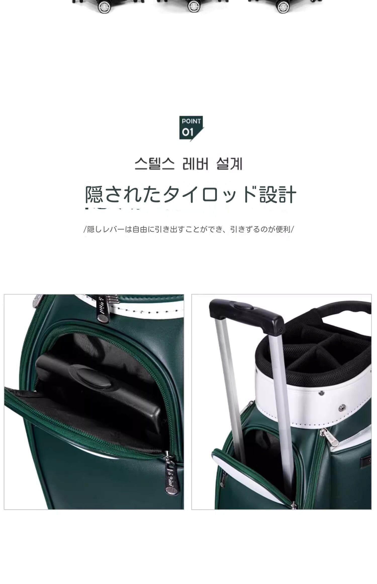 スムーズに移動できる四輪設計で、コース内での持ち運びが楽々。伸縮可能なハンドル付きで、キャリーバッグとしても使用可能です。