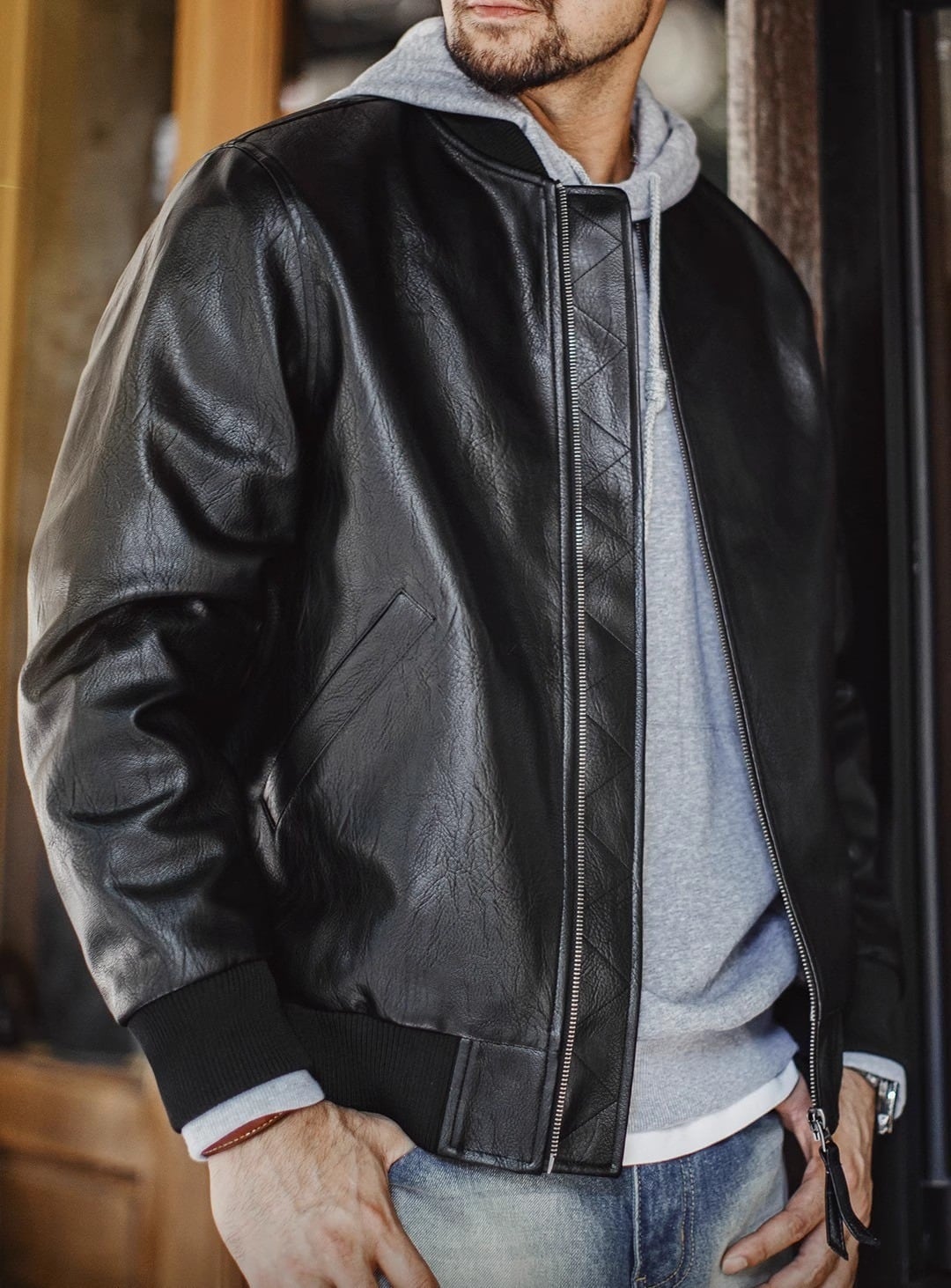 高品質なライチ柄レザーを使用したMA-1タイプのボンバージャケット。ショート丈で洗練されたシルエットが特徴的な、春・秋・冬の三季に対応する万能アウターです。